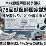第78回獣医師国家試験に向けて~何が変わりどう備えるのか?既卒生合格32.4%からの合格! Meg獣医師国試予備校 第78回獣医師国家試験 何が変わり、どう備えるか 令和8年度から適用される新出題基準の本質と、既卒生が合格率32.4%を突破するために必要な学習設計の転換を解説します。 この記事で分かること 第7 […] 公開済み: 2026年3月23日更新: 2026年3月23日作成者: iwasakiカテゴリー: お知らせ, 国家試験対策コース, 獣医学部応援コンテンツタグ: 獣医師国家試験, 第78回